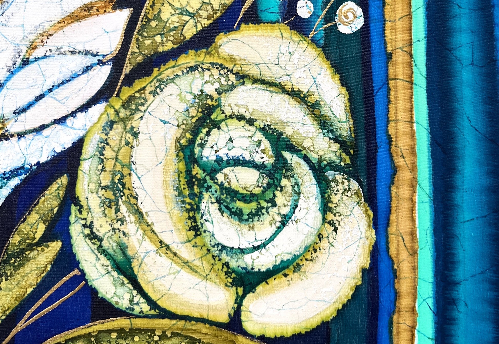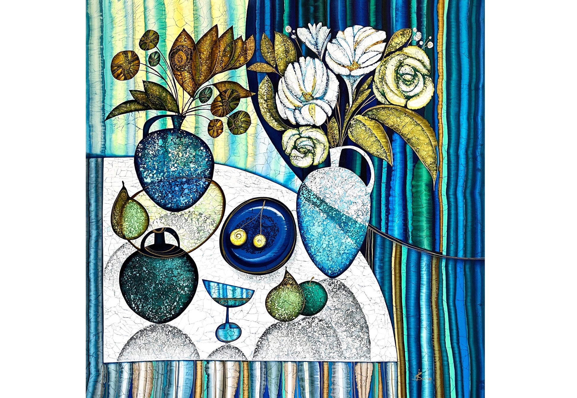 - The artwork is covered with archival quality varnish as a final layer. It has a fine and elegant satin finish and protects silk against dust and other elements