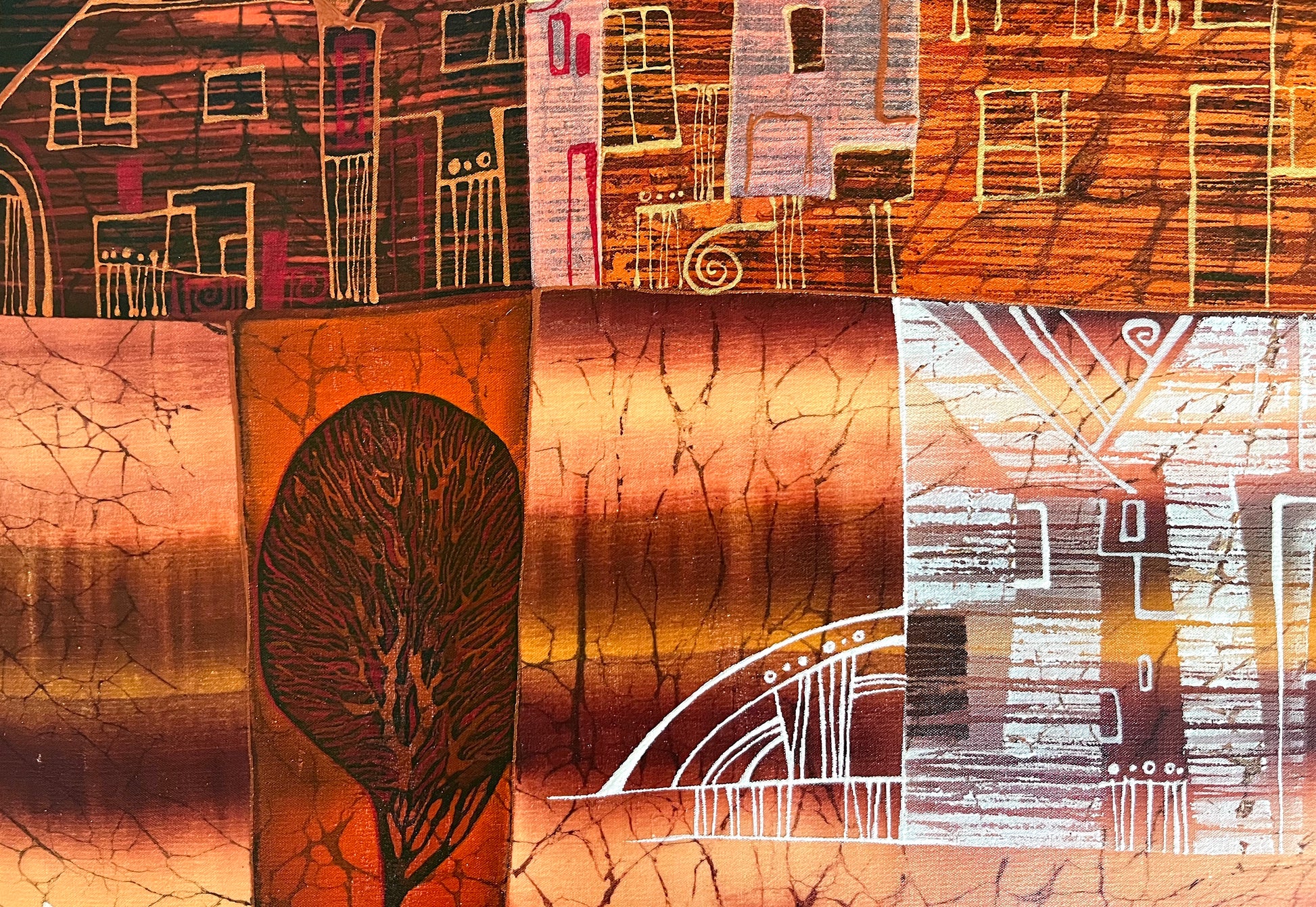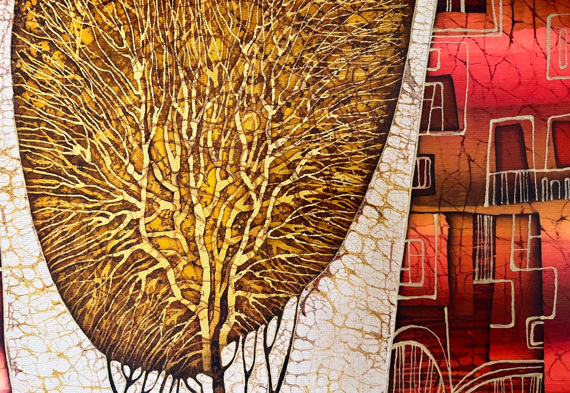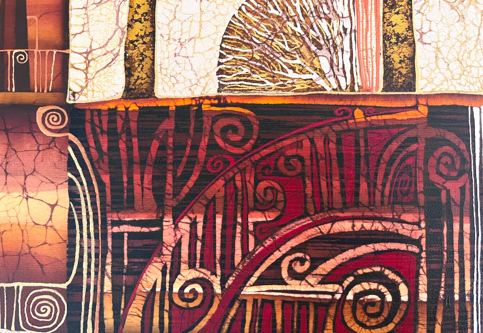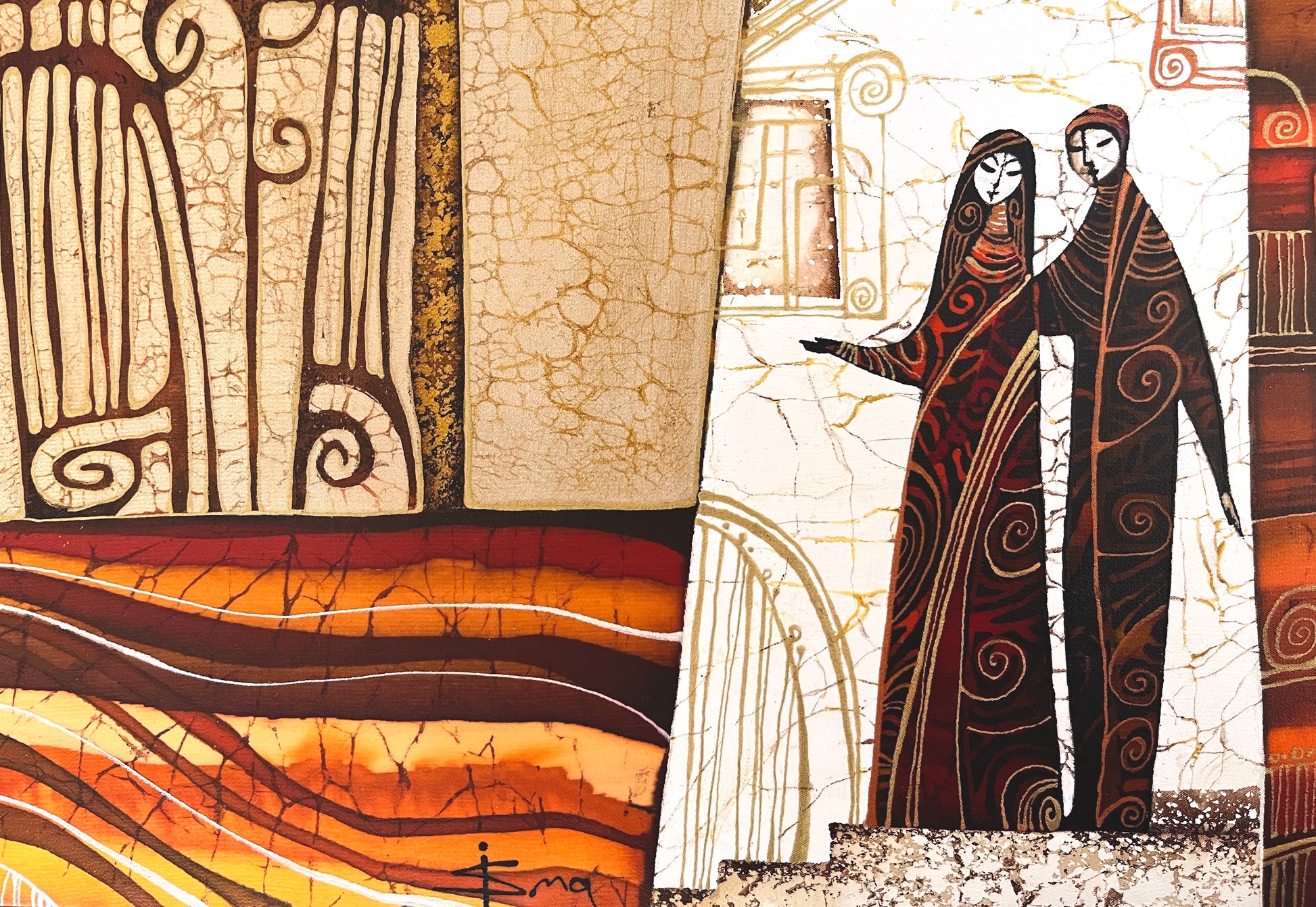 Unity as a harmony of opposites is also being emphasized through the symbolic contrast of using delicately shimmering heavy body golden paints to weightless areas of floating rich deep shades of terracotta, with accents of pure white.
